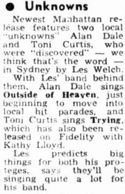 The other record by an Alan Dale is an Australian cover (with Toni Curtis) of Outside Of Heaven, with orchestra conducted by Les Welch, Festival’s Sydney A&R man and music director. It co-charted in 1953 with Eddie Fisher’s American recording (#4 Sydney). Although I haven’t seen it mentioned in any account of rocker Alan Dale, it is plausible that this is him, in his pre-rock’n’roll danceband crooning phase.