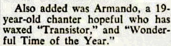 Armando’s full name is Armando Pizzi Jr (born 1940), as shown in the composer credit for the B-side Wonderful Time Of The Year. This appears to be his only release. His father Armando Pizzi Sr was a notable Chicago accordionist and teacher of the instrument.