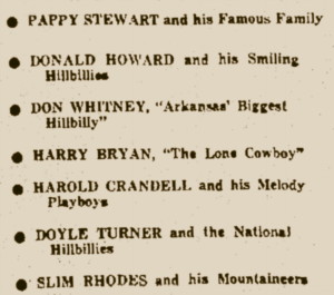 The family was billed at local events as Pappy Stewart’s Family or Pappy Stewart And His Famous Family. For a gig in Charleston, Missouri in October 1945 they were advertised as “Pap Stewart And His Arkansas Cowgirls of Radio Station KLCN, Blytheville“.