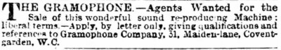 On flat disc issued by The Gramophone Company, a British subsidiary of the American company founded by gramophone and disc inventor Emile Berliner. It was probably recorded in September 1898 in London where Berliner’s associates had studios at 31 Maiden Lane 1898-1900.