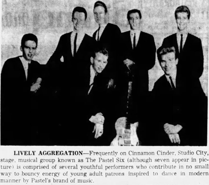 The Pastel Six were one several regular Cinnamon Cinder bands. There were in fact (as you can see) seven of them: Bob Toten, Bill Myers, Dave Cadison, Tony Stealman, Eric Fickert, Rick Rodriguez and Lynn Hamm. They also appeared on Hollywood Dance Time, hosted by Eubanks during 1963 on KTTV Los Angeles, Channel 11.