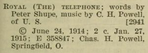 Source: 1. US Copyright Office, Catalog of Copyright Entries, 1915 Musical Compositions, p. 187, facsimile at Internet Archive 2. Royal Telephone sheet music (1925, orig. 1914), facsimile at University of Indiana’s IN Harmony: Sheet Music from Indiana (see especially the title page and first manuscript page).