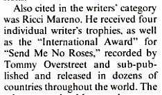References, further reading: 1. Joseph R. Ricci's obituary at Find A Grave gives a good overview of his working life as Ricci Mareno. He was prolific: he has 22 pages of credits at Discogs.com. 2. The Jerry Gillespie entry at Wikipedia lists his main successes, but the three pages of Gillespie's credits at Discogs.com give a better idea of his output. 3. Tommy Overstreet interview at Country Stars Online. 4. Tommy Overstreet biography at All Music.