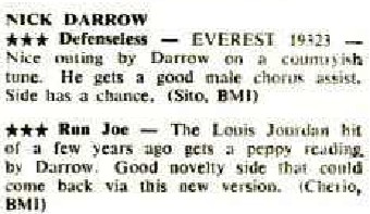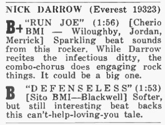 It is seemingly impossible to find any trace of Nick Darrow apart from this solitary single and its thumbnail reviews in Billboard and Cash Box, neither of which has any room for biographical details.