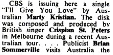 According to the biography at the Marty Kristian website it was Ken Pitt, manager of Crispian St Peters, who arranged for Marty to record a song that Crispian had written and also invited him to come to England where he promised to help with his career.