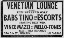 Her first record (1957) was on Philadelphia label Cameo before she switched to Kapp (1961-63). She often featured in ads for local nightspots, and was billed in 1957-58 as Camden’s New Recording Sensation. From around 1964 she appeared as Babs Tino And Her Escorts.