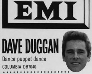 Dave Duggan's recording of Dance Puppet Dance had good credentials, written by a top British songwriter, Les Vandyke, and recorded with Geoff Love's orchestra for a major label. It was reviewed in the pop magazines, played on the BBC, and performed on at least one TV pop show. Thanks to an EMI ad for the single in Pop Weekly, we have a photo of Dave, even if it is severely cropped to show just his head.