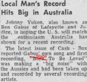 Single on Versatile, a division of Audicon Records. Johnny Yukon was an artist name of the song’s composer Ben Gabus. He released singles under both names.