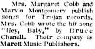 Margaret Cobb, with Marvin Montgomery, became Channel’s joint manager, and she organised his fan club. She was also a music publisher, running Marett Music in Irving with Montgomery. Marett Music was associated with Trojan Records, a local label formed in 1963 by Irving singer Don Martin.