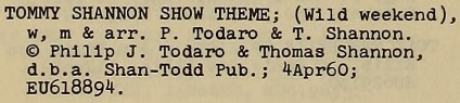 The Tommy Shannon Show Theme (Wild Weekend) was copyrighted in April 1960 by Tom Shannon and his business partner Phil Todaro. They owned the song’s publisher Shan-Todd as well as the Shan-Todd, Corsican, PhiTom and Marlee labels.