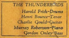 The Thunderbirds were first formed in 1957 by drummer Harold Frith and re-formed in 1958. Over the years its members included Peter Robinson before he became a mainstay of The Strangers, saxman Colin Cook who later had a successful solo career, and Graham Lyall, the notable composer, arranger, producer, music director and teacher. Henri Bource was a Dutch-born saxophonist known through his film Savage Shadows (1969) about surviving a shark attack.