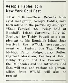 Aesop’s Fables were an 8-piece psychedelic-soul band from Hampstead NY, fronted by vocalist Scott Battari with guitars, drums, keyboard, trumpet, trombone, sax and flute.
