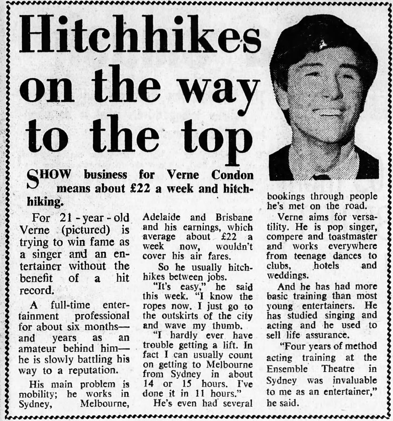 1. “Hitchhikes on the way to the top”, Sun-Herald (Sydney), 11 July 1965, p. 76 (clipping, free view)