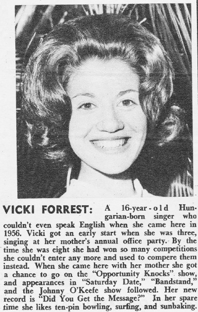 Although she never had a hit record, Vicki Forrest was a frequent presence in Australian media in the late 60s and early 70s.