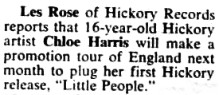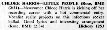 References, further reading: 1. “Little Chloee Reaches For Turntable Pinnacle”, The Tennessean (Nashville), May 24, 1964, p.97 2. Praguefrank at Country Discographies gives approximate session dates of October 1963 and January 1965 for the two Chloee Harris singles. 3. Some Tommy Stough and Jay Rainwater compositions listed at Discogs.com. 4. Brenda Lee biography at Songwriters Hall of Fame and feature from Cincinatti Magazine. 5. Billboard 13 June 1964 (review) and 27 June 1964 (England).